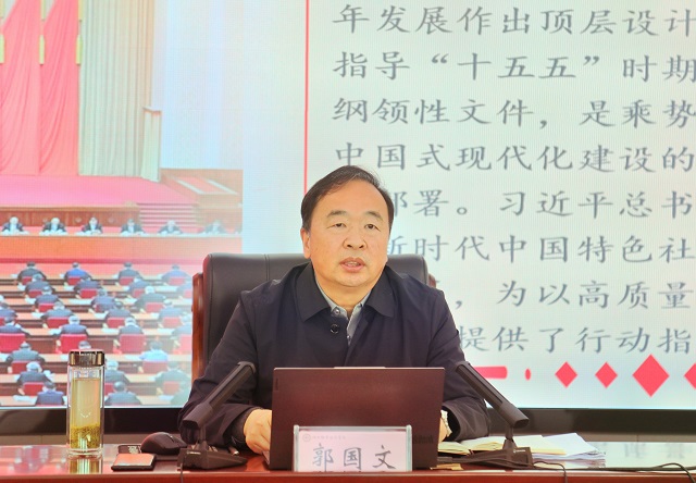 郭国文指出,党的二十届四中全会是在党团结带领全党全国各族人民以中国式现代化全面推进强国建设、民族复兴的关键时期召开的一次十分重要的会议。全会通过的《中共中央关于制定国民经济和社会发展第十五个五年规划的建议》,对未来五年发展作出顶层设计和战略擘画,是指导“十五五”时期经济社会发展的纲领性文件,是乘势而上、接续推进中国式现代化建设的又一次总动员、总部署。习近平总书记的讲话是习近平新时代中国特色社会主义思想的最新发展,为以高质量接续推进中国式现代化提供了行动指南。要深刻领会全会的重大意义、深刻领会习近平总书记在全会上的重要讲话精神、深刻领会“十四五”时期我国发展取得的重大成就、深刻领会“十五五”时期的重要地位、深刻领会“十五五”时期我国发展面临的深刻复杂变化、深刻领会“十五五”时期经济社会发展的指导方针和主要目标、深刻领会“十五五”时期经济社会发展的战略任务和重大举措、深刻领会全党全国各族人民团结起来为实现“十五五”规划而奋斗的重要要求,把思想和行动统一到党中央的重大决策部署和工作要求上来。