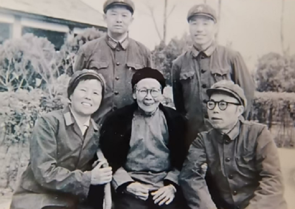 (魏迪仁(右一)和战友 认黄继光的妈妈邓芳芝(前排中)为“黄妈妈”)