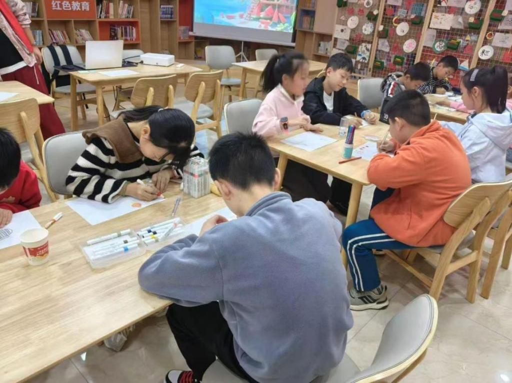最受期待的当属趣味手工环节。志愿者为每个孩子分发粘土、彩笔与画纸,引导大家结合前两个环节的所学创作——有的孩子用彩笔描绘“重阳登高图”,有的用粘土捏出“霜降的柿子树”,还有的发挥想象,捏出带着节气元素的“海底小生物”。过程中,志愿者穿梭在各组之间,对动手较慢的孩子,蹲下身手把手教他们塑形;看到有孩子因捏不好细节着急时,及时鼓励“慢慢来,你捏的柿子很可爱”。当孩子们举着自己的作品展示时,志愿者带头鼓掌,还为每人贴上“创意小达人”贴纸,课堂里满是欢声笑语。
