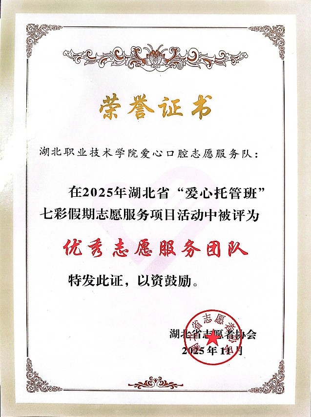 ( 本网讯 张玮 何顺莉 吴逸华 丁璐 梅运悦)近日,在2025年湖北省“爱心托管班”七彩假期志愿服务项目活动中,我校爱心口腔志愿服务队凭借出色的表现和无私的奉献,荣获湖北省志愿者协会“优秀志愿服务团队”称号。