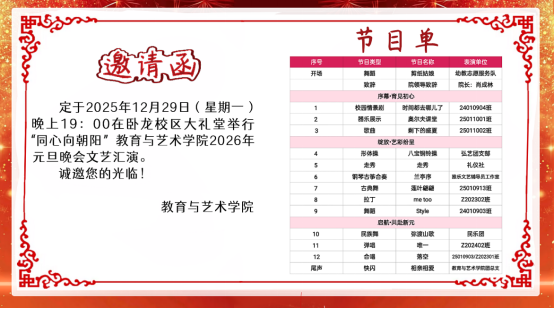 12月29日晚,湖北职业技术学院教育与艺术学院“同心向朝阳”2026年元旦文艺汇演在卧龙校区大礼堂举行,学校相关职能部门、教学院代表、教育与艺术学院师生齐聚一堂,以昂扬向上的精神风貌和丰富多彩的文艺节目,共同迎接2026年的到来。
